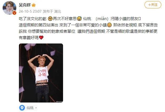 演出后,吴克群再发微博道歉,并表示这里是一个“非常可爱”的地方。